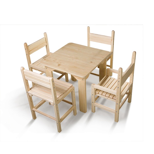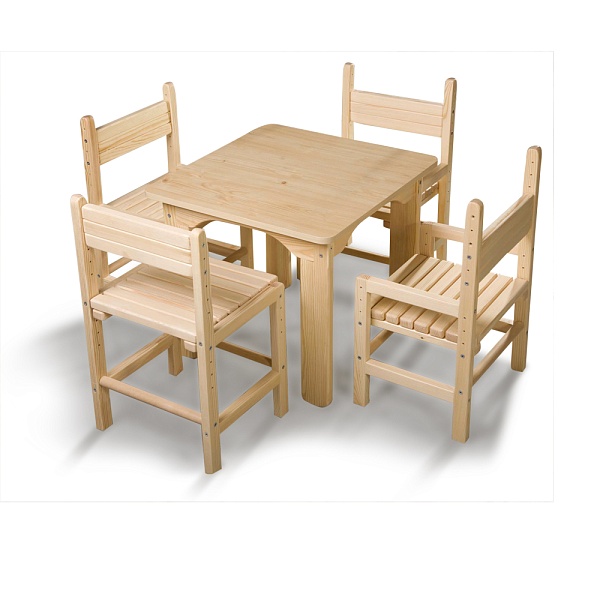 Детский стол и 4 стула сосновые Какой должна быть мебель для детской комнаты? Практичной, экологичной, безопасной и удобной. Детский стол и стул сосновый полностью соответствуют всем этим требованиям. Этот комплект детской мебели, состоящий из столика и четырёх стульев, станет прекрасным дополнением к интерьеру детской комнаты, подойдёт для использования в детских садах и центрах детского творчества. В комплекте детский стол и стул сосновый предусмотрено всё для удобства вашего малыша. Высота стола и стульев позволяет ребёнку играть и принимать пищу самостоятельно, не испытывая дискомфорта. Столик прекрасно подходит для творческого развития ребёнка. Его можно задействовать в процессе занятий лепкой, рисованием или изготовлением поделок, создавая безопасное пространство для творчества и спокойных игр непосредственно в пространстве детской комнаты. Детский стол и стул сосновый отличаются долговечностью, прочностью конструкции, экологичностью. Комплект выполнен в экостиле, изготовлен исключительно из натуральных материалов, а все элементы креплений отличаются прочностью и полностью безопасны для ребёнка. Купите детский стол и стул сосновый для своего ребёнка и подарите ему возможность проявлять самостоятельность, расти и развиваться в комфортных условиях.