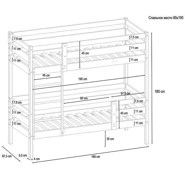1. Защитное ограждение (бортик на 1 и 2 этаж) 2. Лестница 3. Спальное место: 80*190см*2 шт