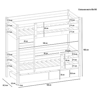 1. Защитное ограждение (бортик на 2 этаж) 2. Лестница 3. Спальное место: 80*190см 2 шт 4. Комплект ящиков 2 шт