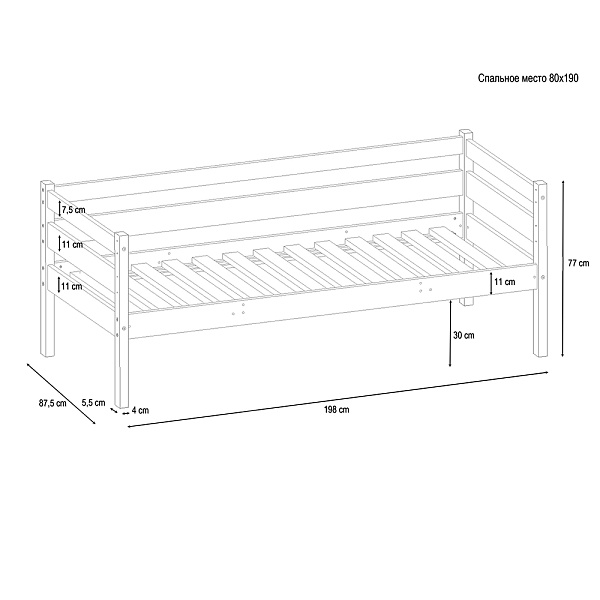 Габариты кровати (ДхШхВ): 198*88*79см