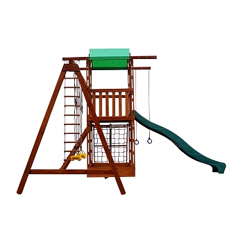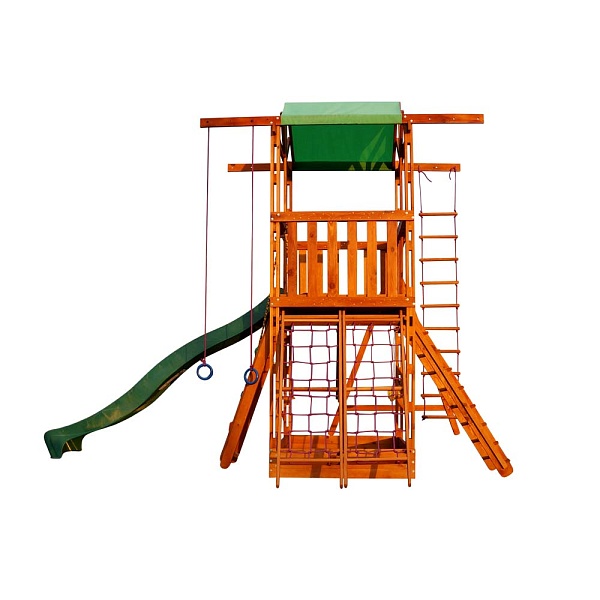 Деревянный игровой комплекс состоит из двух домиков на верхнем и нижнем ярусе конструкции, горки, наклонной сетки и стенки для лазания, качелей, верёвочной лестницы и обычной лесенки для подъёма на верхний ярус. Яркие детали и тент на крыше прекрасно гармонируют с тонированной древесиной сосны, придавая конструкции эстетичность и привлекательность. Детская игровая площадка приведёт в восторг детей любого возраста, ведь каждый ребёнок сможет найти здесь занятие по душе.