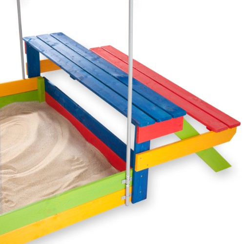 Комплектация товара В комплектацию детской деревянной песочницы входят: основание с удобными деревянными бортиками; столик с лавочкой; тентовая покатая двухсторонняя крыша на металлических опорах. Детская деревянная песочница окрашена в яркие цвета. По вашему желанию, цветовая гамма товара может варьироваться.
