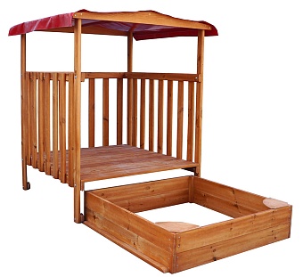 Песочница-трансформер состоит из двух частей: удобной песочницы классической формы и уютной деревянной беседки с навесом, в которой будет комфортно находиться в любую погоду.