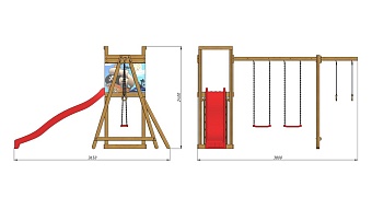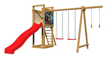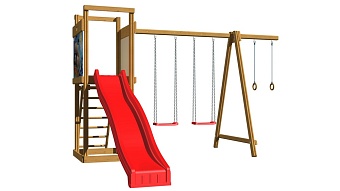 В комплектацию игровой площадки входит удобная широкая горка, кольца для тренировок и качели на металлических цепочках. Длина уголка чуть меньше четырех метров, ширина – 3,6 метра. Площадка прослужит детям для игр много лет благодаря высокопрочной древесине и качественному покрытию из водоэмульсионной краски, защищающей сосну от капризов погоды.