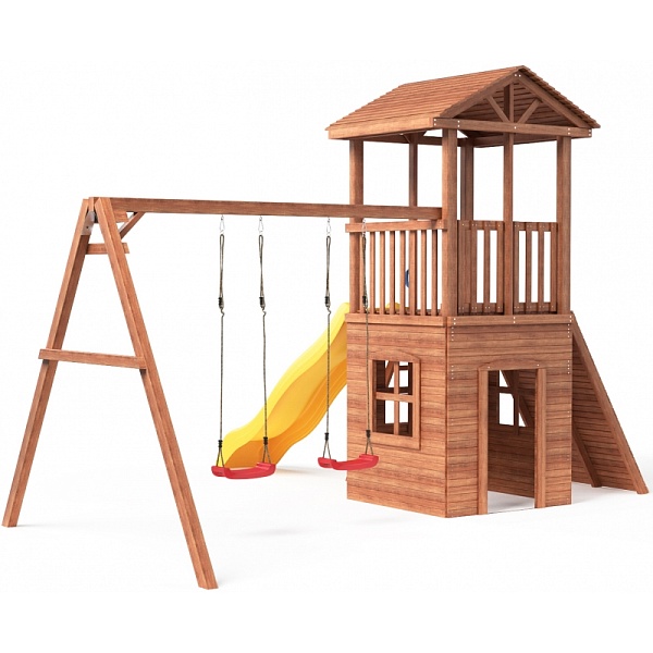 Предназначена для детей от 4 до 15 лет. Силовые детали выполнены из лесоматериалов лиственных и хвойных пород. Размещается площадка на грунте (бетонирование не обязательно). Пространство под башней используется как песочница (120 см на 120 см высота 17 см)- это значительно экономит Ваше пространство. Комплектация: Башня с деревянной крышей; Деревянные качели; Узкая лестница с ручками; Боковая панель дверь; Боковая панель окно - 3 шт; Подвесные качели Лодочка - 2 шт; (можно заменить на любые качели, например, 3 в 1 или гнездо) Горка пластиковая 285 см эксплуатируется круглогодично, оснащена бортиком, долговечна, надежна; Широкий скалодром с зацепами; Крыша деревянная; Песочница под башней. Материалы стандарты качества и безопасность Площадка изготавливается из лесоматериалов лиственных и хвойных пород. Материал имеет естественную древесную текстуру, обработан специальными составами для большего срока использования и предохранения от разрушения древесины. Все элементы проходят предварительную шлифовку - Ваш ребенок никогда не получит заусенцы. Небольшое количество металлических элементов значительно исключает возможность получения ребенком травм. Для обработки изделий мы используем только высококачественную антисептическую пропитку "Норт". При покраске используются высококачественные краски фирмы Helios - Германия. Пластиковые комплектующие европейского качества - производство Голландия, Польша, Китай. Размеры и вес комплекса Высота общая - 326 см; Высота от земли до пола - 150 см; Ширина общая - 430 см; Ширина от башни до горки - 308 см; Длина общая - 500 см; Длина от качели до башни - 412 см; Общий вес: 288,1кг;
