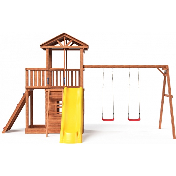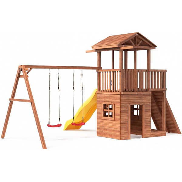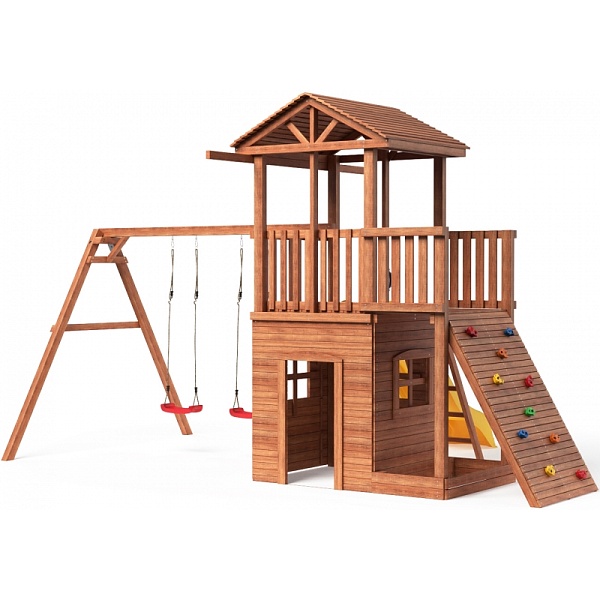 Предназначена для детей от 4 до 15 лет. Силовые детали выполнены из лесоматериалов лиственных и хвойных пород. Размещается площадка на грунте (бетонирование не обязательно). Пространство под башней используется как песочница (120 см на 120 см высота 17 см)- это значительно экономит Ваше пространство. Комплектация: Башня с деревянной крышей; Деревянные качели; Узкая лестница с ручками; Боковая панель дверь; Боковая панель окно - 3 шт; Балкон; Подвесные качели Лодочка - 2 шт; (можно заменить на любые качели, например, 3 в 1 или гнездо) Горка пластиковая 285 см эксплуатируется круглогодично, оснащена бортиком, долговечна, надежна; Широкий скалодром с зацепами; Крыша деревянная; Песочница под башней. Материалы стандарты качества и безопасность Площадка изготавливается из лесоматериалов лиственных и хвойных пород. Материал имеет естественную древесную текстуру, обработан специальными составами для большего срока использования и предохранения от разрушения древесины. Все элементы проходят предварительную шлифовку - Ваш ребенок никогда не получит заусенцы. Небольшое количество металлических элементов значительно исключает возможность получения ребенком травм. Для обработки изделий мы используем только высококачественную антисептическую пропитку "Норт". При покраске используются высококачественные краски фирмы Helios - Германия. Пластиковые комплектующие европейского качества - производство Голландия, Польша, Китай. Размеры и вес комплекса Высота общая - 326 см; Высота от земли до пола - 150 см; Ширина общая - 370 см; Ширина от башни до горки - 308 см; Длина общая - 554 см; Длина от качели до башни - 412 см; Общий вес: 329,7 кг; Количество и размер упаковок
