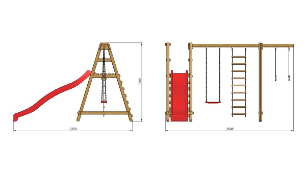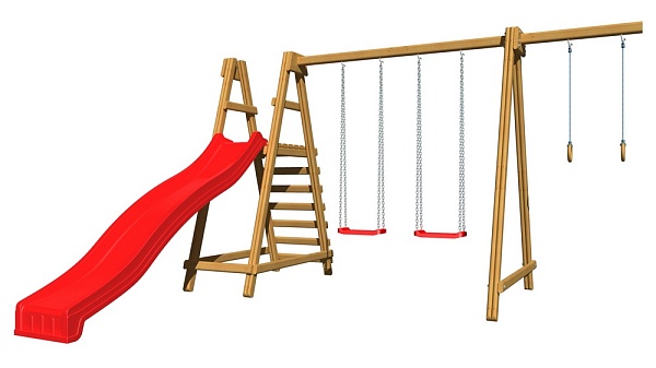 1. Детская горка длина - 3 метра (красная, синяя, зеленая, желтая). 2. Площадка с лестницей. 3. Качели 2 шт. (красные, зеленые) или деревянные. 4. Кольца. Возможно изготовление по индивидуальным размерам в различной комплектации и цветовой гамме. Производитель оставляет за собой право вносить в конструкцию изменения, не ухудшающие эксплуатационные характеристики изделия.
