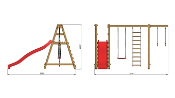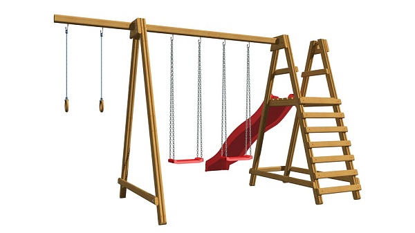 На такой площадке могут играть сразу несколько детей, ведь она оснащена большой горкой, двумя качелями и кольцами. Площадка изготовлена из сосны, покрытой водоэмульсионной краской, что увеличивает срок ее службы. Удобная безопасная конструкция без острых углов позволит играть и развиваться даже малышам. Площадка не требует специальных креплений, и ее длина составляет всего 3,6 метра.