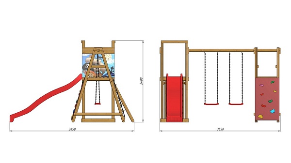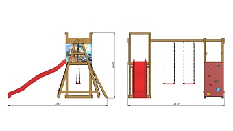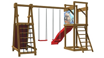 1. Детская горка длина - 3 метра (красная, синяя, зеленая, желтая). 2. Площадка с лестницей. 3. Качели 2 шт. (красные, зеленые) или деревянные. 4. Площадка со скалолазкой и гладиаторской сеткой. Возможно изготовление по индивидуальным размерам в различной комплектации и цветовой гамме. Производитель оставляет за собой право вносить в конструкцию изменения, не ухудшающие эксплуатационные характеристики изделия.