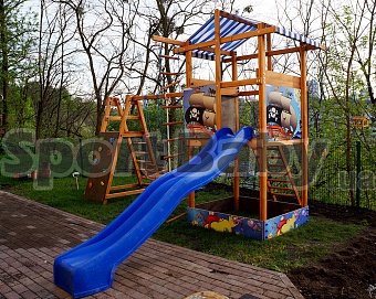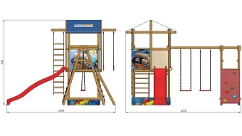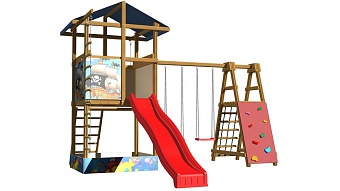 1. Башня с песочницей. 2. Детская горка длина - 3 метра (красная, синяя, зеленая, желтая). 3. Лестница. 4. Площадка со скалолазкой и гладиаторской сеткой. 5. Качели 2 шт. (красные, зеленые) или деревянные. 6. Кольца. 7. Веревочная лестница. Возможно изготовление по индивидуальным размерам в различной комплектации и цветовой гамме. Производитель оставляет за собой право вносить в конструкцию изменения, не ухудшающие эксплуатационные характеристики изделия.