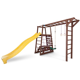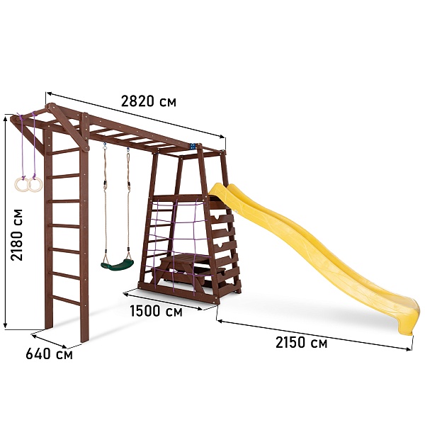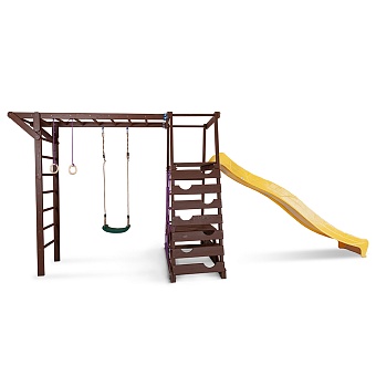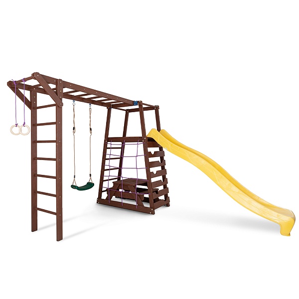 1. Площадка с лестницей. 2. Детская горка длина - 3 метра (красная, синяя, зеленая, желтая). 3. Качели 2 шт. (красные, зеленые) или деревянные. 4. Рукоход. 5. Кольца. Возможно изготовление по индивидуальным размерам в различной комплектации и цветовой гамме. Производитель оставляет за собой право вносить в конструкцию изменения, не ухудшающие эксплуатационные характеристики изделия.