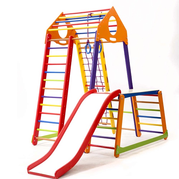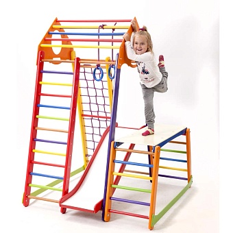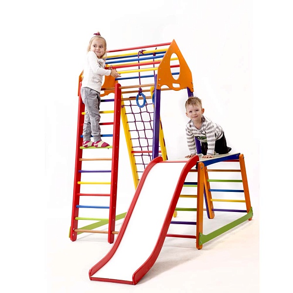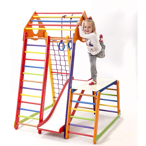 Детский спортивный комплекс для дома BambinoWood Color Plus 1-1 – это усовершенствованная и улучшенная модификация спортивного комплекса BabyWood. Как и его предшественник, он укомплектован универсальными спортивными атрибутами для физического развития ребёнка: В комплектацию изделия входят следующие спортивные элементы: 1. Шведская стенка. 2. Гладиаторская сетка. 3. Рукоход 4. Детская горка Волна 5. Кольца. 6. Стол-пристройка к детскому спорт уголку А для интеллектуального и художественного развития ребёнка, BambinoWood Color Plus 1-1 дополнен оригинальными развивающими элементами: яркими счётами; двухсторонним мольбертом с белой и чёрной основой для рисования и мелками, и маркерами. Все элементы этого спортивного уголка функциональны. Даже округлые ручки наверху изделия можно использовать и для переноски, и для крепежа дополнительных спортивных элементов. Их вы также можете приобрести в нашем интернет-магазине. Для безопасности рекомендуем купить мат гимнастический.