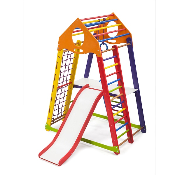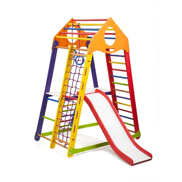 Многоцелевой детский спортивный комплекс BambinoWood Color Plus 2 создан компанией SportBaby для детей младшей возрастной группы (3-7 лет). Оснащение спортивными снарядами и предметами для игр производилось на основе рекомендаций специалистов по детской психологии и физическому воспитанию. Компактность и модульность конструкции позволяет использовать ее как при обустройстве игровых площадок на открытом воздухе, так и в помещениях. Спортивно-игровой тренажер оснащен всем необходимым навесным и неподвижным оборудованием, которое может понадобиться для спортивных занятий и подвижных игр. Горка для скатывания легко снимается и не мешает выполнению гимнастических упражнений. Передвижная навесная лесенка и настилы облегчают доступ к горке и снарядам. Детский спортивный комплекс BambinoWood Color Plus 2 отзывы получил отличные, благодаря качественным материалам и надежной конструкции. Для изготовления несущих опор и соединительных элементов применяется зрелая древесина сосны. Перекладины лестниц вытачиваются из высококачественного бука. Веревочные лестницы и подвески гимнастических колец изготавливаются из прочных синтетических шнуров. Металлический крепеж закрывается пластмассовыми колпачками. Все поверхности хорошо проструганы, отшлифованы и окрашены яркими красками, что придает изделию привлекательный вид и предотвращает получение травм во время игр и тренировок. Монтаж детского спортивно-игрового комплекса не требует специальных креплений. Для его устойчивого положения достаточно собрать конструкцию на ровной и твердой поверхности. Детский спортивный комплекс BambinoWood Color Plus 2 купить можно по выгодной цене и обеспечить малышу веселое времяпровождение.
