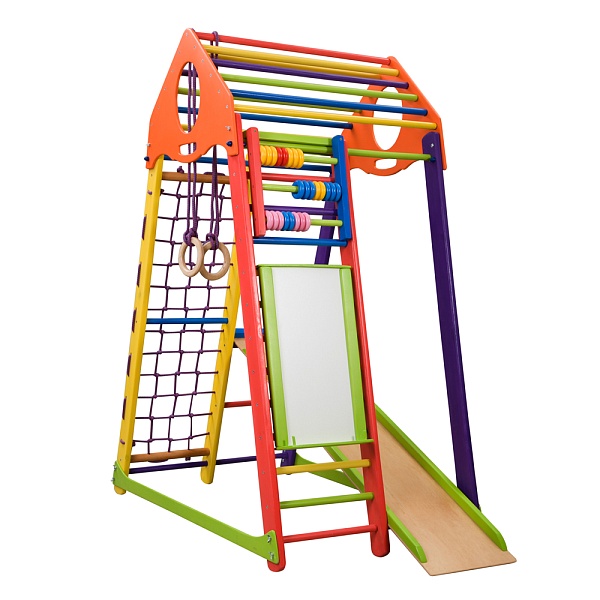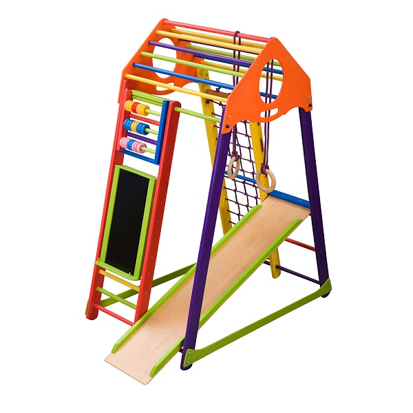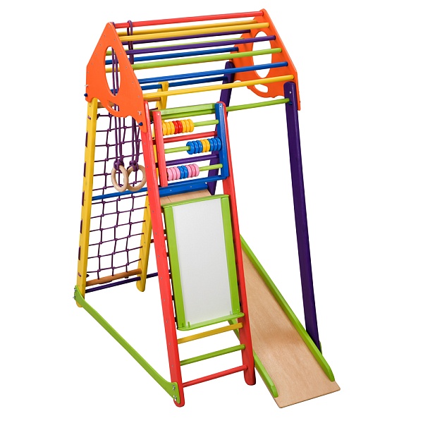1. Шведская стенка. 2. Гладиаторская сетка. 3. Рукоход 4. Детская горка. 5. Счеты «цветные». 6. Мольберт. (для мел/маркер) 7. Кольца. Все эти спортивные атрибуты способствуют развитию ловкости и силы малыша, его мелкой моторики, реакции и координации движений. А оригинальные игровые элементы помогут развить логику, математические способности и художественные навыки ребёнка. К ним относятся: яркие оригинальные счёты; двухсторонний мольберт с белой и чёрной основой, что позволяет рисовать на нём и мелками, и маркерами. Удобные закруглённые ручки, расположенные наверху изделия, вы можете использовать как для его переноски, так и для крепежа дополнительных спортивных элементов, которые вы можете приобрести в нашем интернет-магазине.