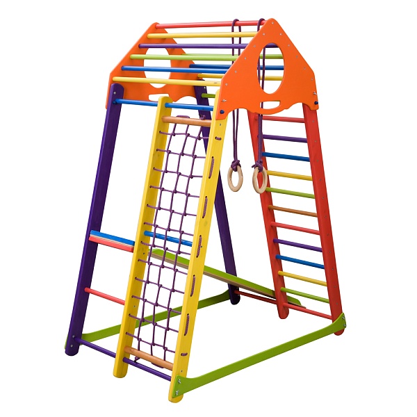 1. Шведская стенка. 2. Гладиаторская сетка. 3. Рукоход 4. Детская горка. 5. Кольца. Все эти спортивные атрибуты способствуют развитию ловкости и силы малыша, его мелкой моторики, реакции и координации движений. А оригинальные игровые элементы помогут развить логику, математические способности и художественные навыки ребёнка. К ним относятся: яркие оригинальные счёты; двухсторонний мольберт с белой и чёрной основой, что позволяет рисовать на нём и мелками, и маркерами. Удобные закруглённые ручки, расположенные наверху изделия, вы можете использовать как для его переноски, так и для крепежа дополнительных спортивных элементов, которые вы можете приобрести в нашем интернет-магазине.