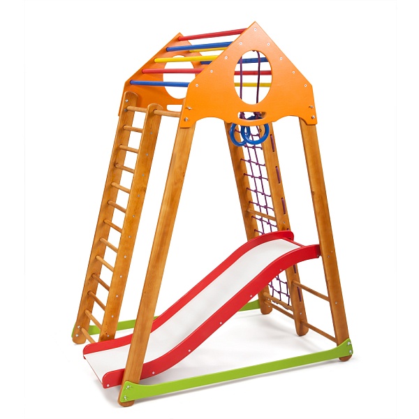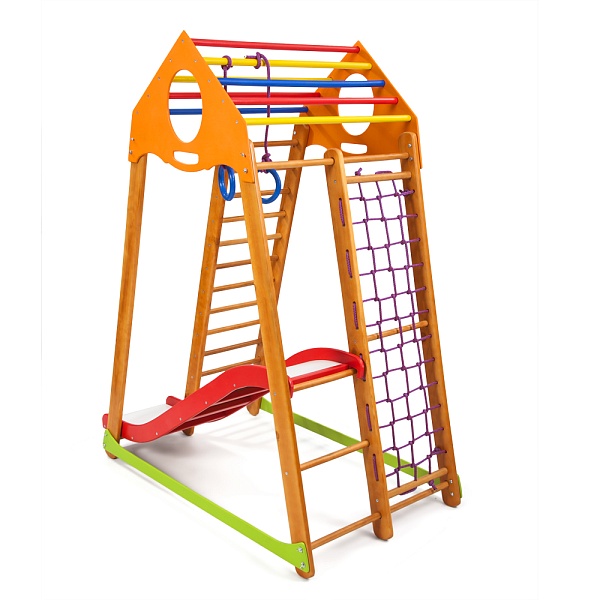 1. Шведская стенка. 2. Гладиаторская сетка. 3. Рукоход 4. Детская горка Волна 5. Кольца. Все эти спортивные атрибуты способствуют развитию ловкости и силы малыша, его мелкой моторики, реакции и координации движений. А оригинальные игровые элементы помогут развить логику, математические способности и художественные навыки ребёнка. К ним относятся: яркие оригинальные счёты; двухсторонний мольберт с белой и чёрной основой, что позволяет рисовать на нём и мелками, и маркерами. Удобные закруглённые ручки, расположенные наверху изделия, вы можете использовать как для его переноски, так и для крепежа дополнительных спортивных элементов, которые вы можете приобрести в нашем интернет-магазине.