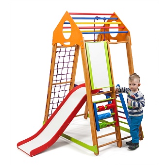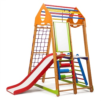 1. Шведская стенка. 2. Гладиаторская сетка. 3. Рукоход 4. Детская горка Волна 5. Счеты «цветные». 6. Мольберт. (для мел/маркер) 7. Кольца. 8. Столик 9. Лестница Все эти спортивные атрибуты способствуют развитию ловкости и силы малыша, его мелкой моторики, реакции и координации движений. А оригинальные игровые элементы помогут развить логику, математические способности и художественные навыки ребёнка. К ним относятся: яркие оригинальные счёты; двухсторонний мольберт с белой и чёрной основой, что позволяет рисовать на нём и мелками, и маркерами. Удобные закруглённые ручки, расположенные наверху изделия, вы можете использовать как для его переноски, так и для крепежа дополнительных спортивных элементов, которые вы можете приобрести в нашем интернет-магазине.