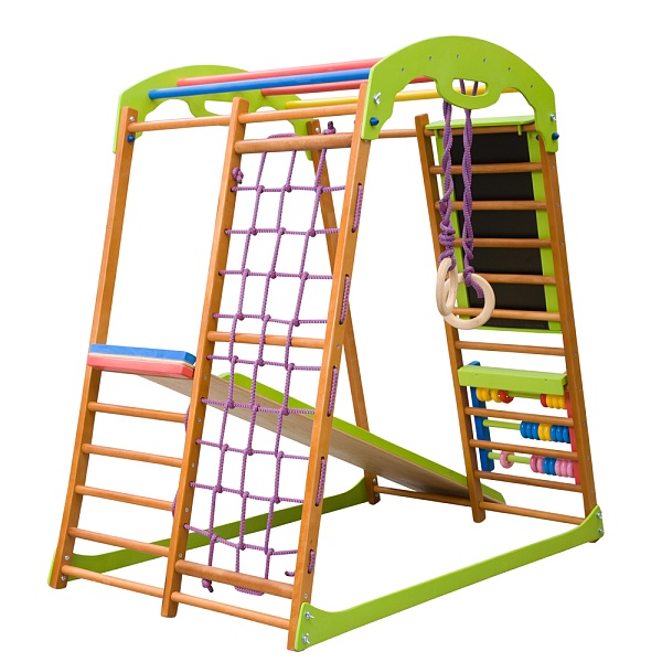 Детский спортивный комплекс для дома BabyWood Plus – это усовершенствованная и улучшенная модификация спортивного комплекса BabyWood. Как и его предшественник, он укомплектован универсальными спортивными атрибутами для физического развития ребёнка: В комплектацию изделия входят следующие спортивные элементы: 1. Шведская стенка. 2. Гладиаторская сетка. 3. Рукоход 4. Детская горка. 5. Счеты «цветные». 6. Мольберт. (для мел/маркер) 7. Кольца. А для интеллектуального и художественного развития ребёнка, BabyWood Plus дополнен оригинальными развивающими элементами: яркими счётами; двухсторонним мольбертом с белой и чёрной основой для рисования и мелками, и маркерами. Все элементы этого спортивного уголка функциональны. Даже округлые ручки наверху изделия можно использовать и для переноски, и для крепежа дополнительных спортивных элементов. Их вы также можете приобрести в нашем интернет-магазине. Для безопасности рекомендуем купить мат гимнастический.