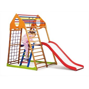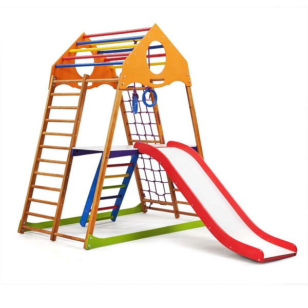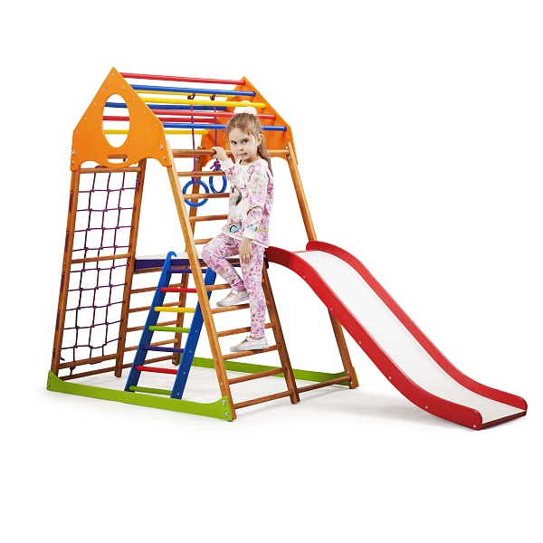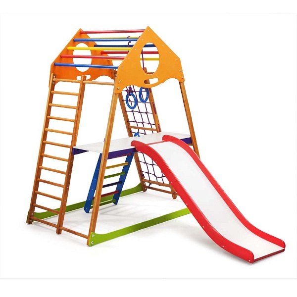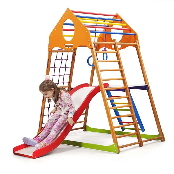 1. Шведская стенка. 2. Гладиаторская сетка. 3. Рукоход 4. Детская горка. 5. Кольца. 6. Столик 7. Лестница Все эти спортивные атрибуты способствуют развитию ловкости и силы малыша, его мелкой моторики, реакции и координации движений. А оригинальные игровые элементы помогут развить логику, математические способности и художественные навыки ребёнка. К ним относятся: яркие оригинальные счёты; двухсторонний мольберт с белой и чёрной основой, что позволяет рисовать на нём и мелками, и маркерами. Удобные закруглённые ручки, расположенные наверху изделия, вы можете использовать как для его переноски, так и для крепежа дополнительных спортивных элементов, которые вы можете приобрести в нашем интернет-магазине.