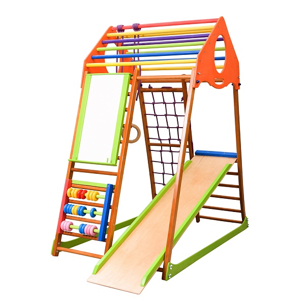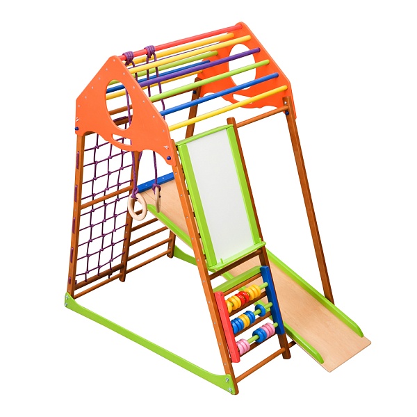 1. Шведская стенка. 2. Гладиаторская сетка. 3. Рукоход Ракета 4. Детская горка. 5. Счеты «цветные». 6. Мольберт. (для мел/маркер) 7. Кольца. Все эти спортивные атрибуты способствуют развитию ловкости и силы малыша, его мелкой моторики, реакции и координации движений. А оригинальные игровые элементы помогут развить логику, математические способности и художественные навыки ребёнка. К ним относятся: яркие оригинальные счёты; двухсторонний мольберт с белой и чёрной основой, что позволяет рисовать на нём и мелками, и маркерами. Удобные закруглённые ручки, расположенные наверху изделия, вы можете использовать как для его переноски, так и для крепежа дополнительных спортивных элементов, которые вы можете приобрести в нашем интернет-магазине.