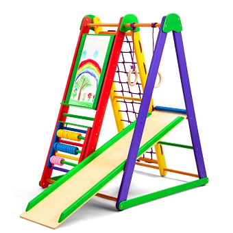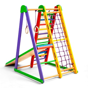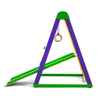 1. Шведская стенка. 2. Гладиаторская сетка. 3. Детская горка. 4. Счеты «цветные». 5. Мольберт.(для мел/маркер) 6. Кольца. Все эти спортивные атрибуты способствуют развитию ловкости и силы малыша, его мелкой моторики, реакции и координации движений. А оригинальные игровые элементы помогут развить логику, математические способности и художественные навыки ребёнка. К ним относятся: яркие оригинальные счёты; двухсторонний мольберт с белой и чёрной основой, что позволяет рисовать на нём и мелками, и маркерами.