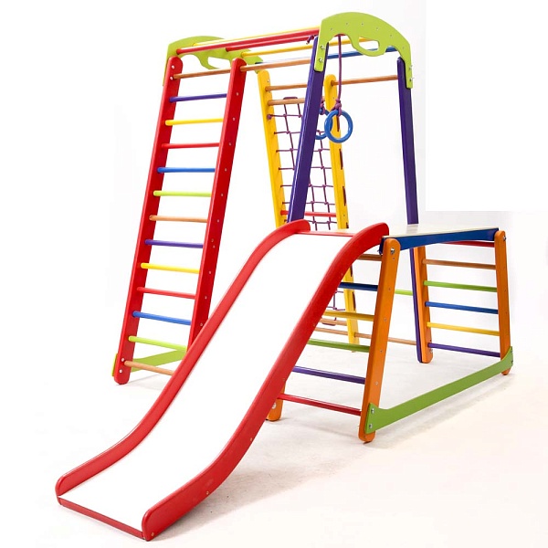 1. Шведская стенка. 2. Гладиаторская сетка. 3. Рукоход 4. Детская горка Волна 5. Кольца. 6. Стол-пристройка к детскому спорт уголку