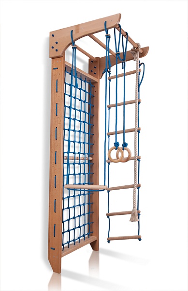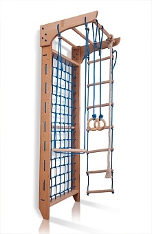 Гладиаторская сетка с турником "Kinder 8 - 220" с каркасом из натурального массива сосны крепится к поверхности стены, не требует специальных познаний при сборке. В состав базовой комплектации входят турник и верёвочная лестница с перекладинами из прочного бука, фанерные кольца (можно заменитьнатуральным деревом сосны), канат из натурального хлопка и гимнастическая перекладина.