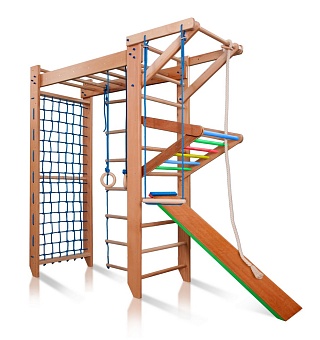 1. Шведская стенка с турником. 3. Гладиаторская сетка (поставляется в собранном виде). 4. Рукоход. 5. Канат. 6. Кольца. 7. Трапеция. 8. Веревочная лестница. 9. Детский сьемный турник. 10. Доска для пресса. А так же крепежный комплект. Для безопасности рекомендуем купить мат гимнастический. Детский спортивный уголок поставляется в разобранном виде.