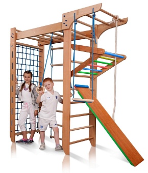 Детский уголок с рукоходом - «Bambino 5-220» отличный спортивно-развлекательный комплекс, предлагаемый нашим магазином по довольно доступной цене. Активно занимаясь на данном уголке, Ваш малыш будет иметь крепкое здоровье, прекрасное настроение и всестороннее физическое развитие организма. Более того, этот спорткомплекс является настолько прочным, что сможет позволить заниматься на нём всем членам семьи – даже самым взрослым. Древесина бука, из которого построено данное приспособление, является невероятно прочной, надёжной и долговечной. Входят в конструкцию данного уголка такие элементы: гладиаторская сетка, шведская стенка вместе с турником, скамья для пресса, гимнастические кольца, рукоход, канат, верёвочная лестница, трапеция и съёмный турник.