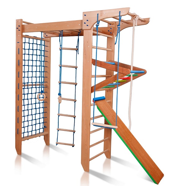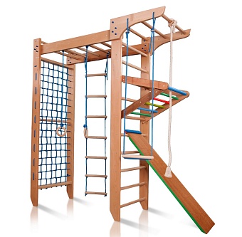 Детский уголок с рукоходом - «Bambino 5-240 – многофункциональный детский спорткомплекс, выполненный из бука. Его П-образная конструкция позволяет ему занимать немного свободного места в детской комнате, что является особо удобным способом размещения такой модели в современных комфортабельных постройках или в загородных домах с довольно высокими потолками. Данная модель является настоящим детским мини-спортзалом, универсальным и очень компактным. Здесь для своих спортивных забав сможет найти огромное раздолье и каждый взрослый, и малыш. Оснащено оборудование надёжными гимнастическими кольцами, верёвочной лестницей, канатом, трапецией и доской для пресса.