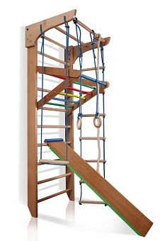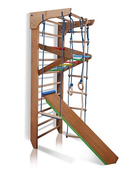 Спортивный уголок «Bambino 3-220» - универсальная, прекрасно составленная мини-версия настоящего спортивного зала. Установив спортивный уголок в детской комнате Вашего малыша, Вы подарите ему множество ярких впечатлений, эмоций и крепкое здоровье благодаря сильным и крепким мышцам, хорошей фигуре, правильной осанке. Данная модель является отличным стимулом для ребёнка для разнообразных спортивных занятий в игровой форме, а также огромным простором для полной реализации всех его возможностей, фантазий и желаний. Различные элементы спорткомплекса можно сочетать друг с другом или использовать как отдельный тренажёр – гимнастические кольца, съёмный турник, крепкий канат, надёжную скамью для пресса, верёвочную лестницу, трапецию и шведскую стенку.