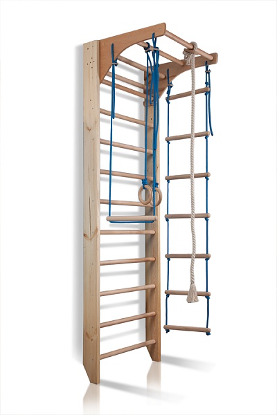 1. Шведская стенка с турником. 2. Канат. 3. Кольца. 4. Трапеция. 5. Веревочная лестница. 6. Турник А так же крепежный комплект. Для безопасности рекомендуем купить мат гимнастический. Детский спортивный уголок поставляется в разобранном виде.