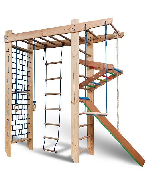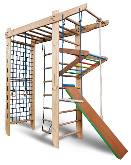 1. Шведская стенка с турником. 3. Гладиаторская сетка (поставляется в собранном виде). 4. Рукоход. 5. Канат. 6. Кольца. 7. Трапеция. 8. Веревочная лестница. 9. Детский сьемный турник. 10. Доска для пресса. А так же крепежный комплект. Для безопасности рекомендуем купить мат гимнастический. Детский спортивный уголок поставляется в разобранном виде.