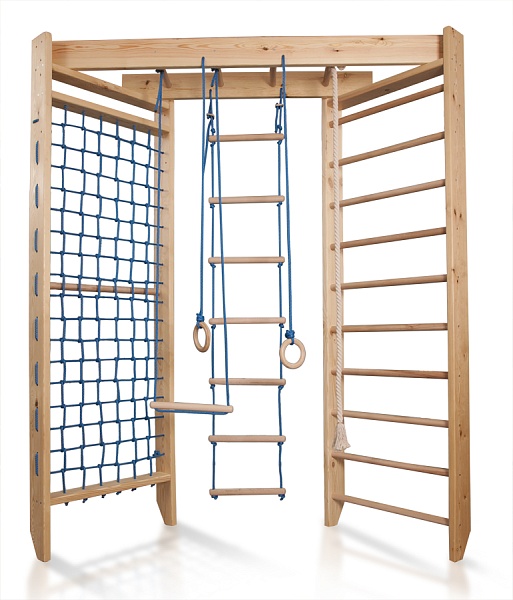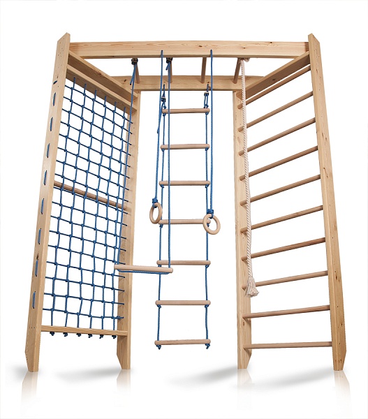 Спортивная стенка для детей «Sport 4-240» - модель, дающая возможность обустроить полноценный, хоть и небольшой спортивный зал даже в довольно маленькой квартире. Такая стенка обязательно станет любимым местом для игр Вашего ребёнка и его друзей, позволяя им развивать гибкость, ловкость, силу и координацию движений, что, само собой, будет способствовать укреплению организма малыша и общему его оздоровлению. Выполнена данная стенка из прочного экологически безопасного материала, выдерживающего значительные нагрузки. Состоит модель из нескольких секций – гладиаторской сетки, шведской стенки, поперечных перекладин, гимнастических колец, каната и верёвочной лестницы.
