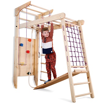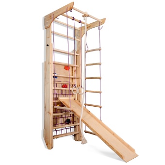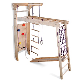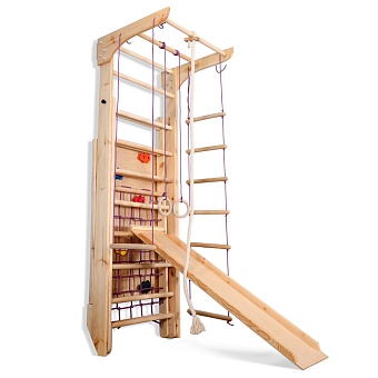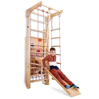1. Шведская стенка с турником. 3. Гладиаторская сетка (поставляется в собранном виде). 4. Рукоход. 5. Канат. 6. Кольца. 7. Трапеция. 8. Веревочная лестница. 9. Доска для пресса. 10. Скалолазка. А так же крепежный комплект. Для безопасности рекомендуем купить мат гимнастический. Детский спортивный уголок поставляется в разобранном виде.