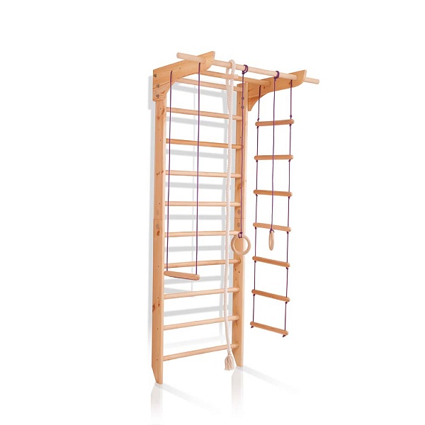 1. Шведская стенка. 2. Турник. 3. Канат. 4. Кольца. 5. Трапеция. 6. Веревочная лестница. 7. Доска для пресса. А так же крепежный комплект. Для безопасности рекомендуем купить мат гимнастический.