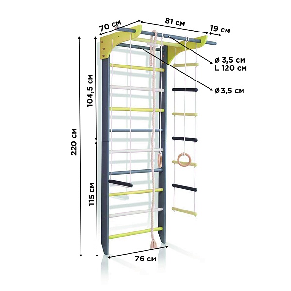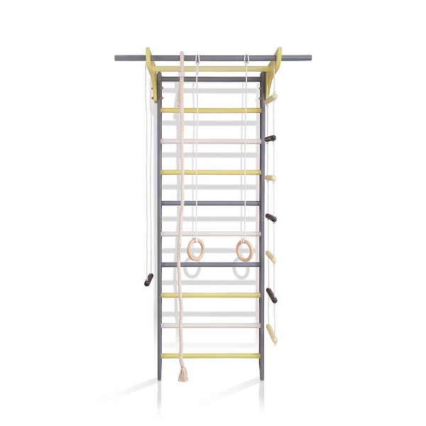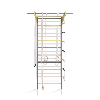 1. Шведская стенка. 2. Турник. 3. Канат. 4. Кольца. 5. Трапеция. 6. Веревочная лестница. 7. Доска для пресса. А так же крепежный комплект. Для безопасности рекомендуем купить мат гимнастический.