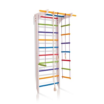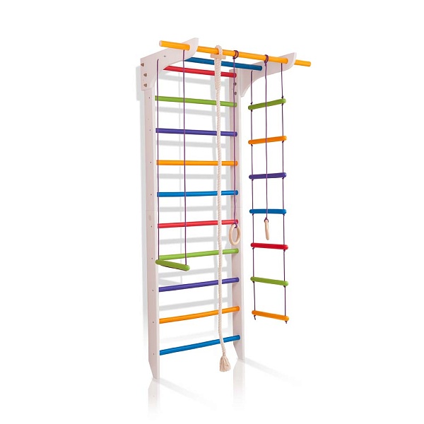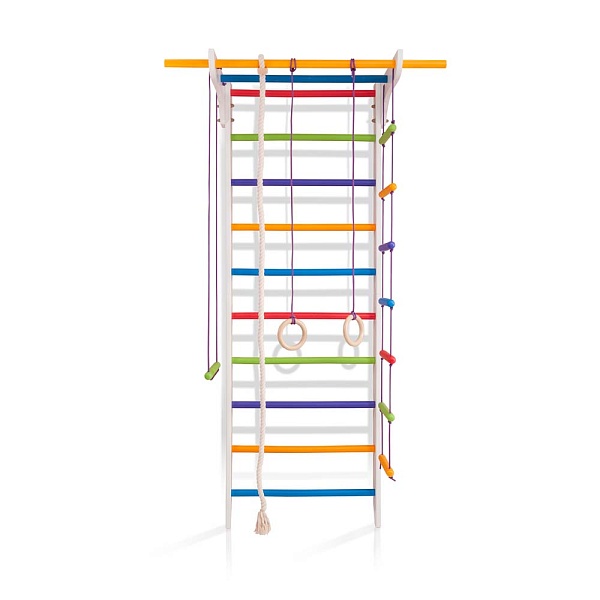 1. Шведская стенка. 2. Турник. 3. Канат. 4. Кольца. 5. Трапеция. 6. Веревочная лестница. 7. Доска для пресса. А так же крепежный комплект. Для безопасности рекомендуем купить мат гимнастический.