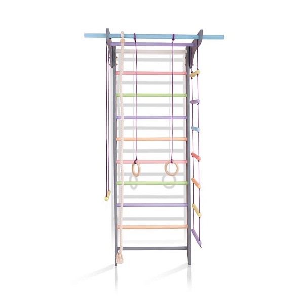 1. Шведская стенка. 2. Турник. 3. Канат. 4. Кольца. 5. Трапеция. 6. Веревочная лестница. 7. Доска для пресса. А так же крепежный комплект. Для безопасности рекомендуем купить мат гимнастический.