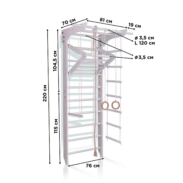 1. Шведская стенка. 2. Турник. 3. Канат. 4. Кольца. 5. Трапеция. 6. Веревочная лестница. 7. Доска для пресса. А так же крепежный комплект. Для безопасности рекомендуем купить мат гимнастический.
