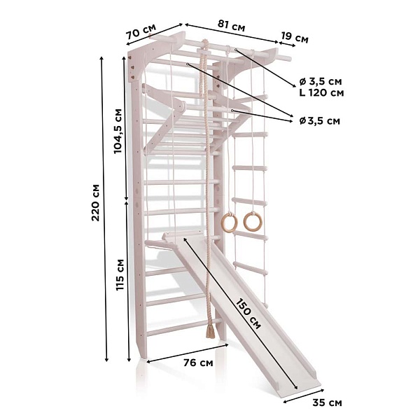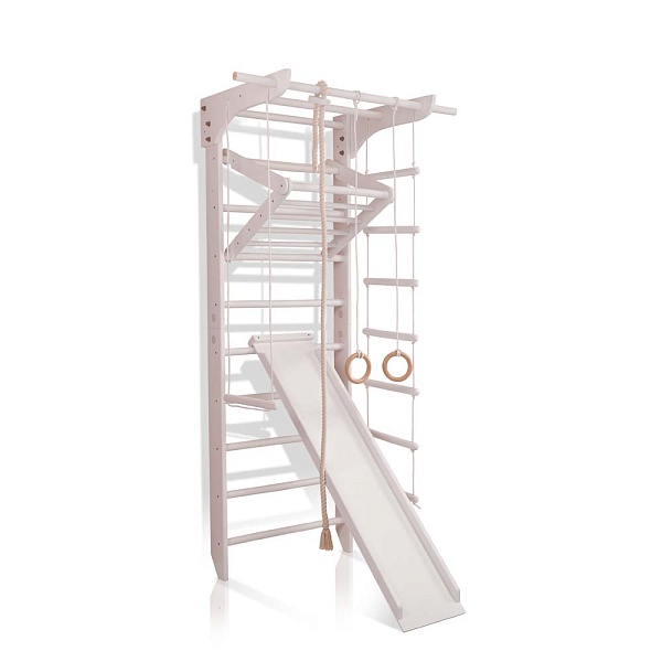1. Шведская стенка. 2. Турник. 3. Канат. 4. Кольца. 5. Трапеция. 6. Веревочная лестница. 7. Доска для пресса. А так же крепежный комплект. Для безопасности рекомендуем купить мат гимнастический.