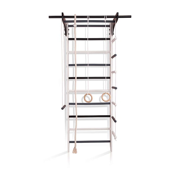 1. Шведская стенка. 2. Турник. 3. Канат. 4. Кольца. 5. Трапеция. 6. Веревочная лестница. 7. Доска для пресса. А так же крепежный комплект. Для безопасности рекомендуем купить мат гимнастический.