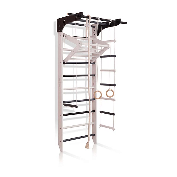 1. Шведская стенка. 2. Турник. 3. Канат. 4. Кольца. 5. Трапеция. 6. Веревочная лестница. 7. Доска для пресса. А так же крепежный комплект. Для безопасности рекомендуем купить мат гимнастический.
