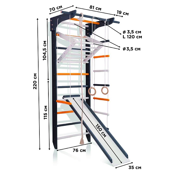 1. Шведская стенка. 2. Турник. 3. Канат. 4. Кольца. 5. Трапеция. 6. Веревочная лестница. 7. Доска для пресса. А так же крепежный комплект. Для безопасности рекомендуем купить мат гимнастический.