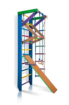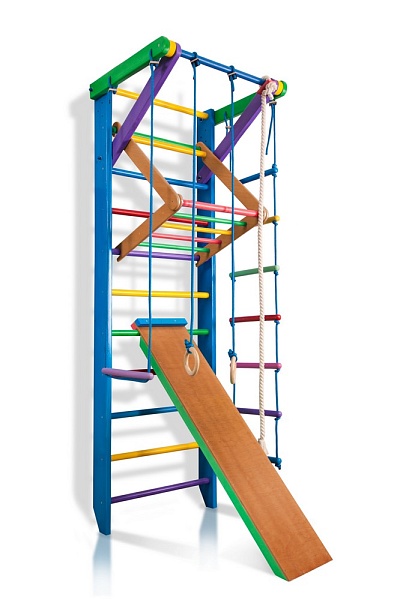 Спортивный уголок «Радуга 3-240» - яркий и красочный детский тренажёр, привлекающий внимание детей не только разнообразием красок, но также и разнообразием своего спортивного снаряжения. Данная модель станет настоящим другом для малыша любого возраста, займёт его внимание, доставит невообразимое удовольствие, а, главное, позволит прекрасно укрепить организм, развить мышцы рук, ног. живота и позвоночника. В комплектации спортивного уголка «Радуга 3-240» присутствуют шведская стенка с турником, трапеция, гимнастические кольца, канат, верёвочная лестница, доска для пресса и съёмный турник.