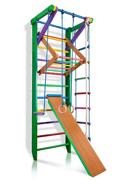 1. Шведская стенка с турником. 2. Канат. 3. Кольца. 4. Трапеция. 5. Веревочная лестница. 6. Детский сьемный турник-рукоход. 7. Доска для преса.. А так же крепежный комплект. Для безопасности рекомендуем купить мат гимнастический. Детский спортивный уголок поставляется в разобранном виде.