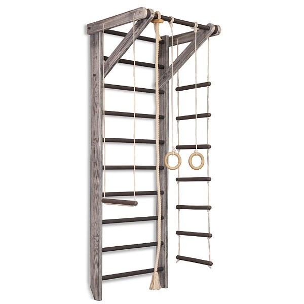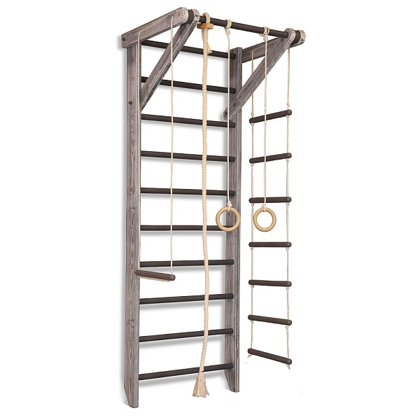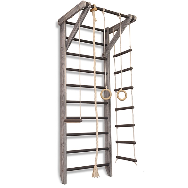 1. Шведская стенка с турником. 2. Канат. 3. Кольца. 4. Трапеция. 5. Веревочная лестница. А так же крепежный комплект. Для безопасности рекомендуем купить мат гимнастический. Детский спортивный уголок поставляется в разобранном виде.